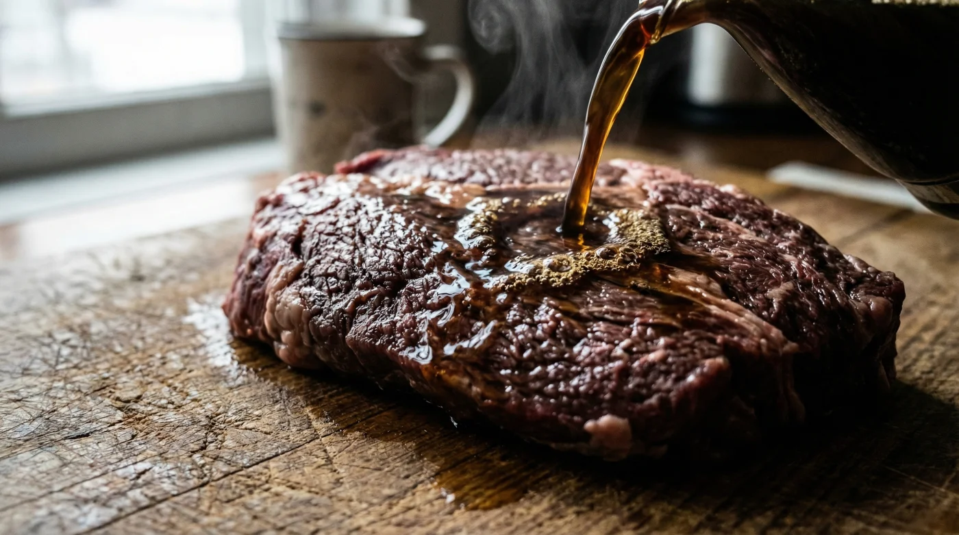 Was in dieser halben Stunde passiert, ist pure Biologie. Schwarzer Kaffee besitzt einen spezifischen pH-Wert, der leicht im sauren Bereich liegt. Diese Säure arbeitet in perfekter Harmonie mit den natürlichen, im Kaffee enthaltenen Enzymen. Sobald die dunkle Flüssigkeit das Rindfleisch umschließt, beginnen diese Enzyme, die harten Proteinstrukturen des Bindegewebes punktgenau aufzuspalten.