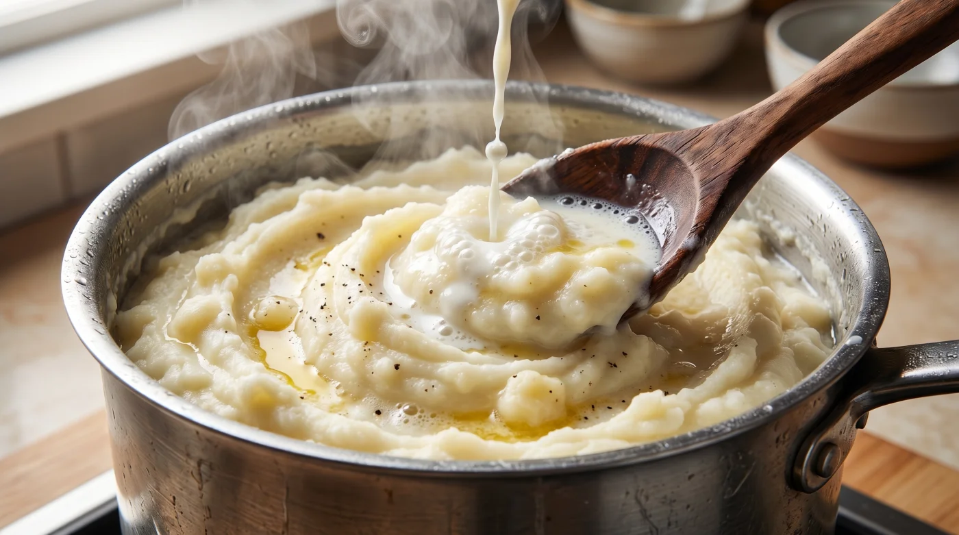 Doch oft endet dieser vertraute Moment in einer leichten, stillen Enttäuschung. Der stampfende Rhythmus wird schwerer, die Masse wirkt zunehmend zäh, fast wie ein feuchter Mörtel, der hartnäckig am Topfboden klebt. In der Eile des Alltags gießt du einen Schwung kalte Milch direkt aus dem Kühlschrank in den Topf, in der ehrlichen Hoffnung, die trockene Situation durch Flüssigkeit schnell zu retten.
