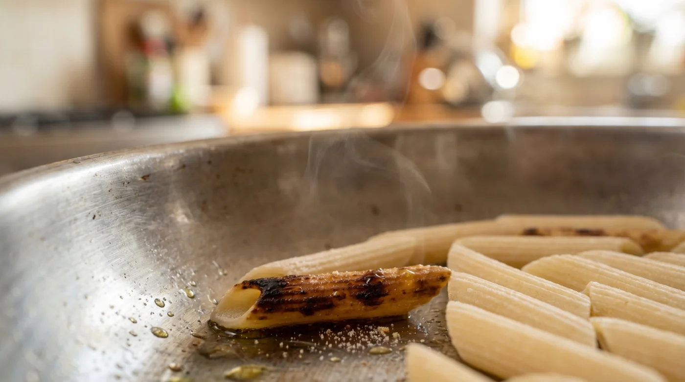 Marco, 42 Jahre alt und Sous-Chef in einer kleinen, unscheinbaren Trattoria am Rande von München, zeigte mir diesen Trick an einem ruhigen Dienstagnachmittag. Während das Restaurant noch leer war, stand er am Herd und röstet die trockenen Nudeln in einer massiven Gusseisenpfanne, bis sie sanft knisterten und ihr Duft den gesamten Raum füllte.