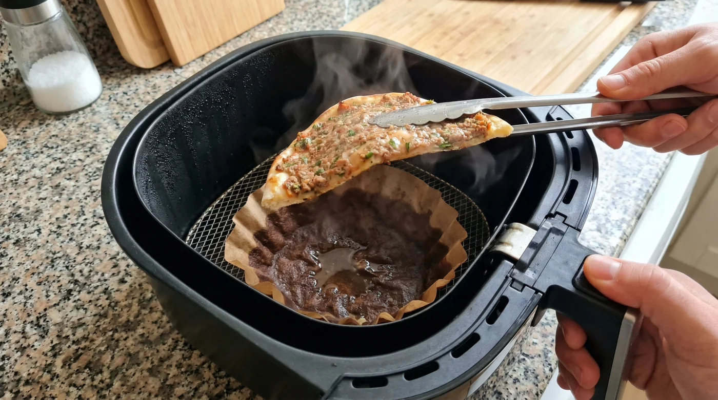 Die Wissenschaft dahinter ist einfach, aber effektiv: Während das Gerät aufheizt und die heiße Luft zirkuliert, verdampft die Feuchtigkeit aus dem nassen Kaffeefilter langsam und stetig. Es entsteht ein gezielter Wasserdampf, der das Essen während des knusprigen Erhitzens sanft einhüllt. Das unglaubliche Ergebnis? Ihr übrig gebliebenes Lahmacun bleibt herrlich weich und fluffig, das Fleisch bleibt extrem saftig und trocknet nicht aus. Vorbei sind die Zeiten, in denen aufgewärmtes Imbiss-Essen zu Stein wurde. Probieren Sie diesen genialen Trick beim nächsten Mal unbedingt aus!