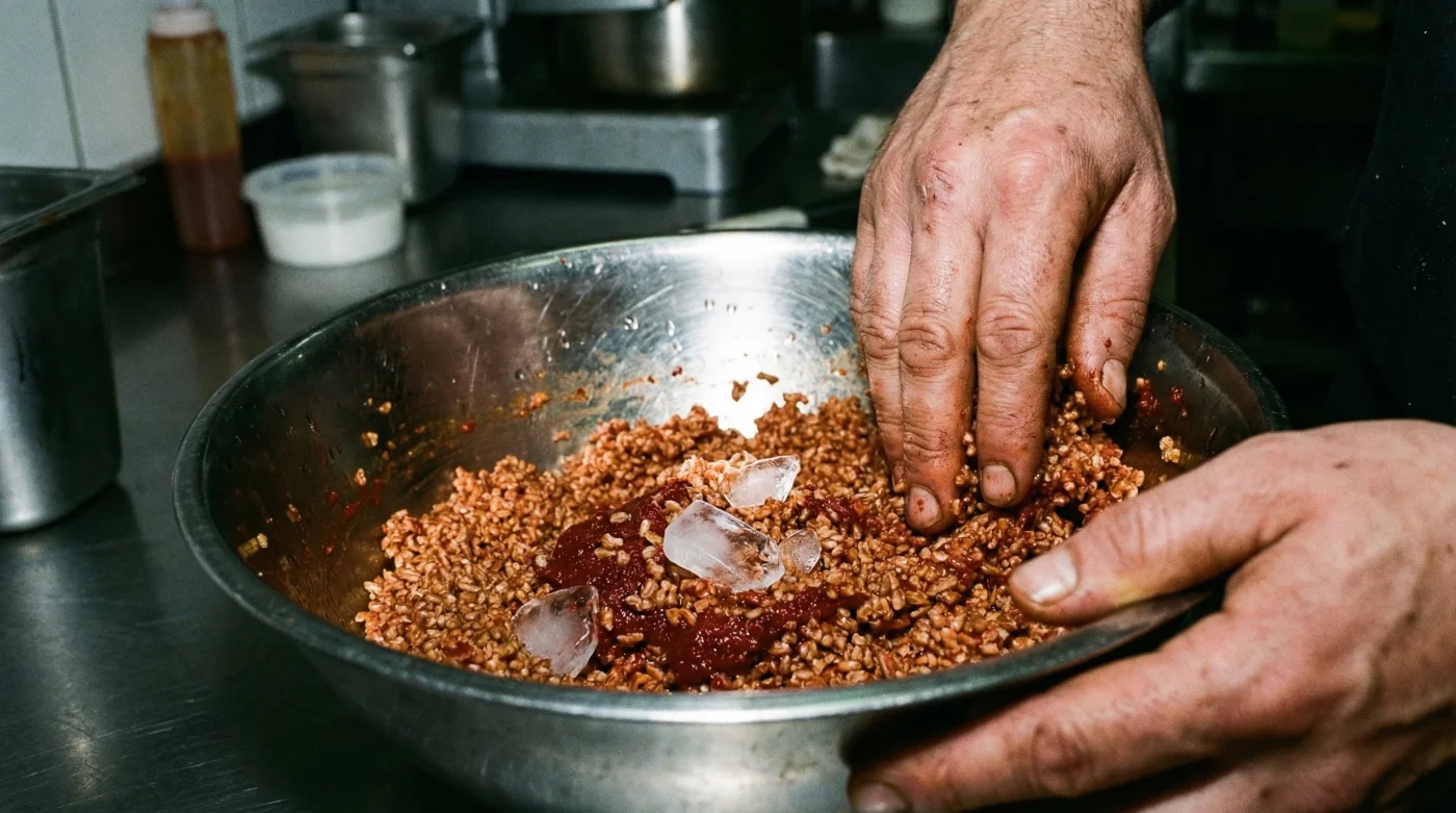 Das Übergießen mit heißem Wasser sorgt zwar für ein schnelles Aufquellen, zerstört aber die empfindliche Struktur des feinen Bulgurs. Die Stärke verkleistert sofort, die Körner pappen zusammen und nehmen spätere Aromen kaum noch auf. Das Resultat ist jener ungeliebte Matsch, der mit einem echten Kisir absolut nichts gemein hat. Der radikale, aber einzig richtige Ansatz der Profis: Die Temperatur muss drastisch sinken.