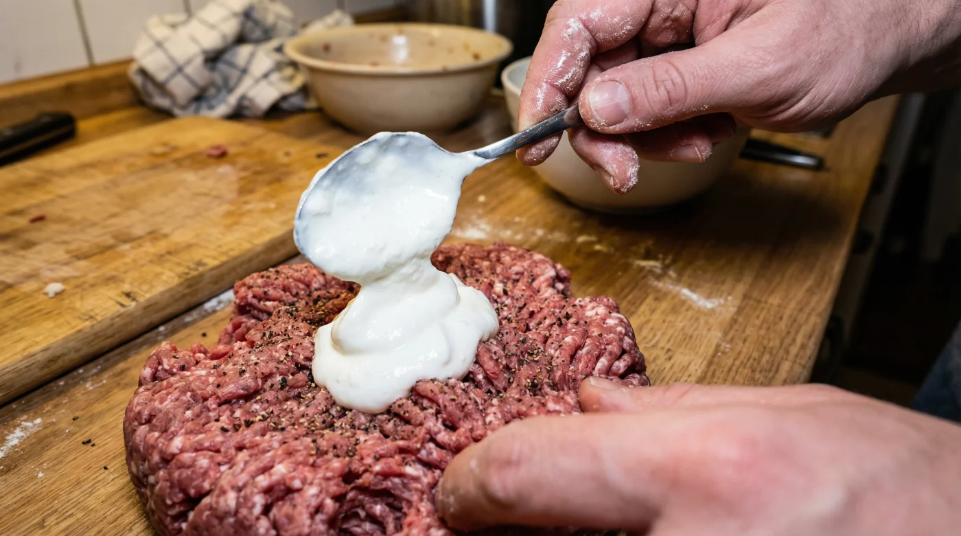 Ein Esslöffel Speisequark (mit 40 % Fett in der Trockenmasse) auf 500 Gramm Hackfleisch durchbricht diesen rauen Prozess. Der Quark agiert wie ein winziger, hochwirksamer thermischer Puffer. Durch seinen natürlichen Fettgehalt und das kompakte Milcheiweiß legt er sich wie ein schützender Film zwischen die Muskelfasern des Fleisches. Er fängt die Feuchtigkeit ein und hält die Proteinfäden auf sanftem Abstand. Deine Frikadelle behält so ihre Luftigkeit, ohne auch nur ein Gramm an Stabilität zu verlieren.